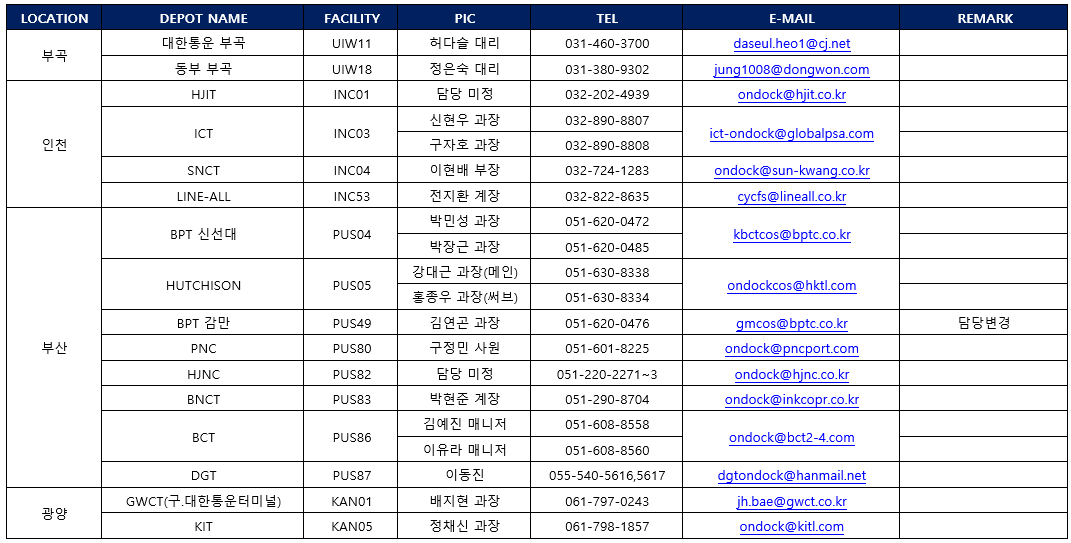 TERMINAL/DEPOT 담당 및 연락처 업데이트 (2025.12월)